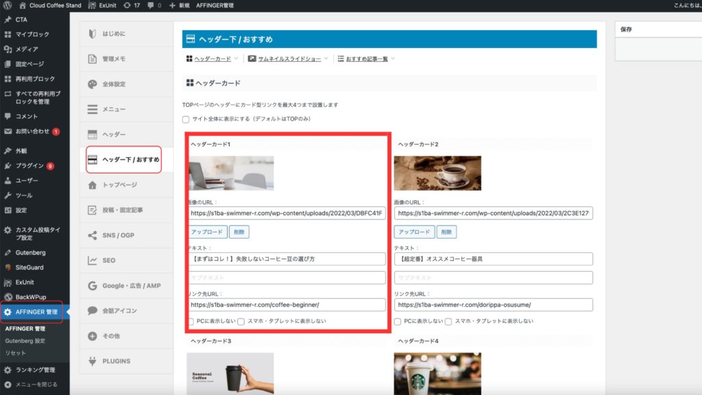 「ダッシュボード」→「AFFINGER管理」→「ヘッダー下/おすすめ」→「おすすめ記事一覧」