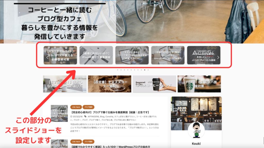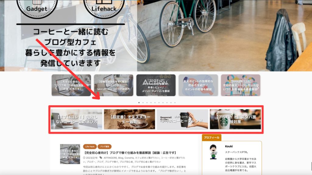 AFFINGER6(アフィンガー6)ではヘッダー画像の下にスライドショーを設置できます。こんな感じです(下図)!