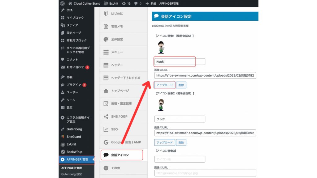 作り方はかんたんで「ダッシュボード」→「AFFINGER管理」→「会話・ファビコン等」→「会話風アイコン」に進み、