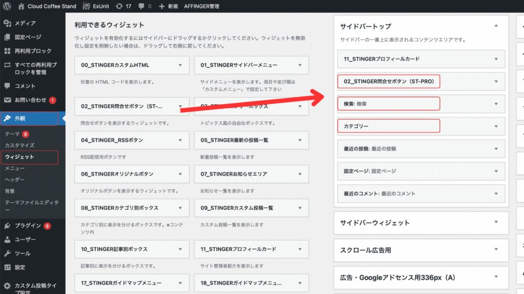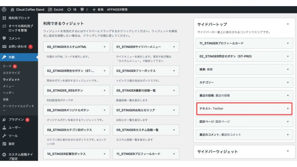 次に自分のブログの「ダッシュボード」→「ウィジェット」に戻り、利用できるウィジェットから「テキスト」をサイドバートップにクリック&ドラッグしましょう。