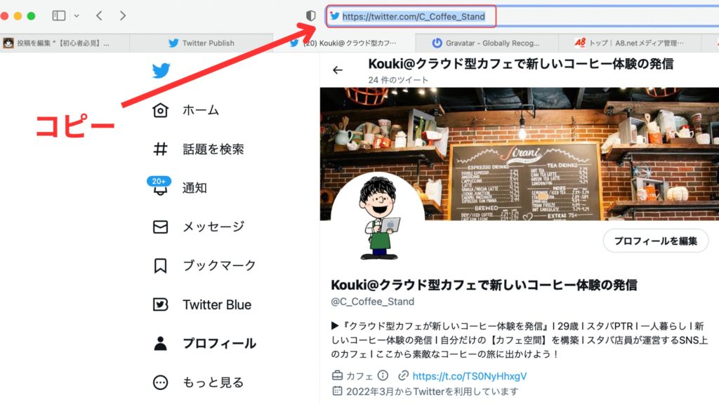 まず「Twitter Publish」にアクセスします。そして自分のTwitterのプロフィールをブラウザから開いて、URLをコピーしてください。