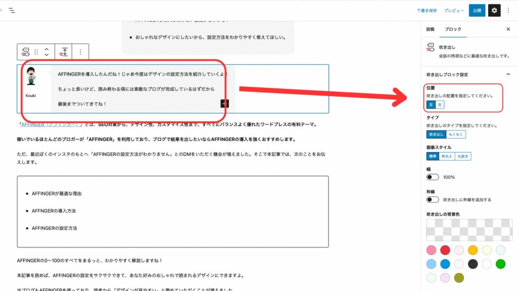 なので記事の右側に表示させたい場合は、吹き出しをクリックして右側の「吹き出しブロック設定」で「右」を選択すると右側に表示されますよ。