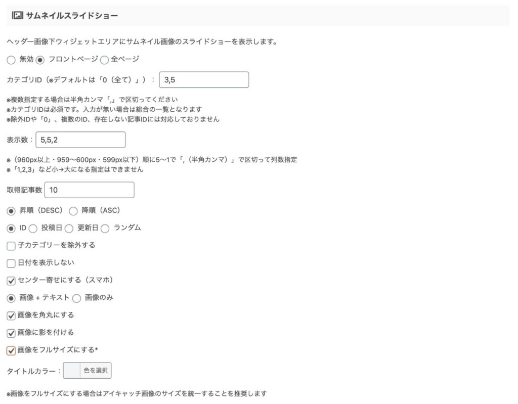 サムネイルスライドショー機能を有効化します。有効化するにはフロントページ全ページにチェックを入れてください(初期設定では無効にチェックが入っています)。どちらを選ぶかによって表示される範囲が違ってきます。