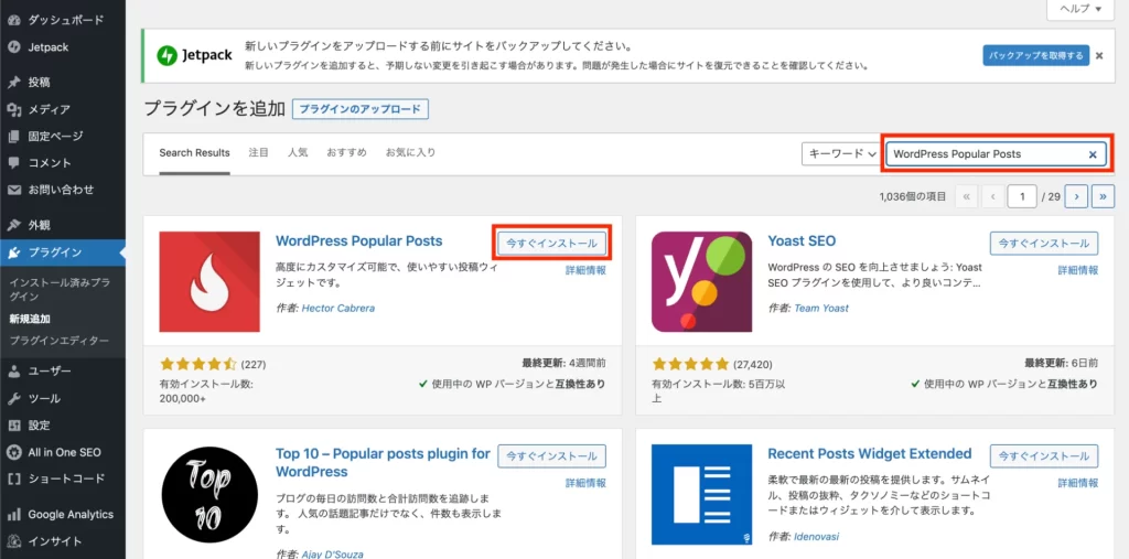 手順②:プラグイン名で検索してインストール