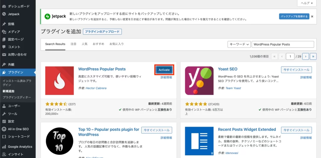手順③:プラグインを有効化(Activate)する