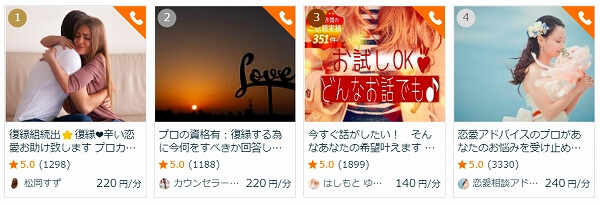 試しにココナラ「悩み相談・恋愛相談・話し相手」のカテゴリーを覗いてみると、こんな感じです。
