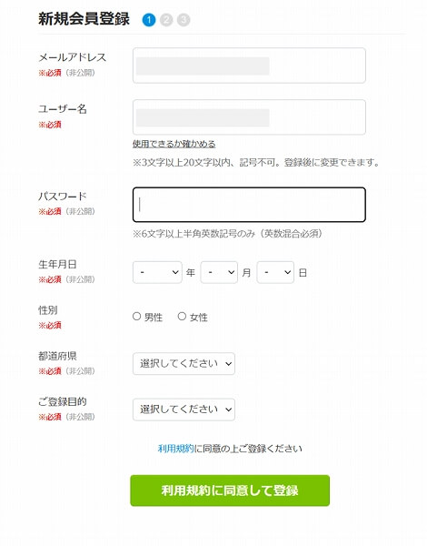 ③会員情報を入力し【利用規約に同意して登録】をクリック