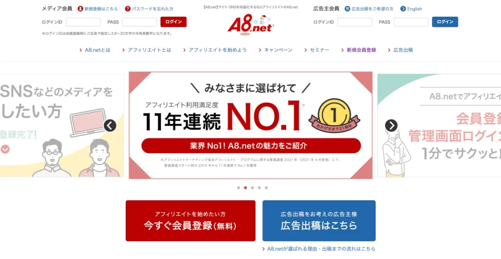 A8.netは誰がなんと言おうと、ブロガー登録必須のASPです。私もメインで使っています。